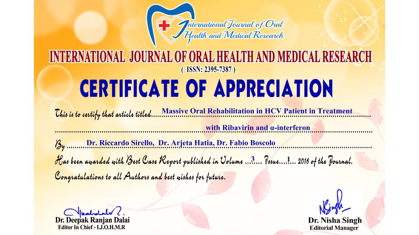 Massive Oral Rehabilitation in HCV Patient in Treatment with Ribavirin and α-interferon. L'articolo ha ricevuto un "Certificate of appreciation" dalla rivista che lo ospita.